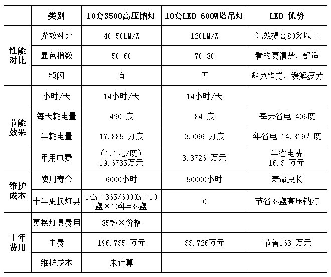 深圳沙井某房地產(chǎn)建筑工地項(xiàng)目,原計劃采用10套3500W高壓鈉燈,更換LED燈具后與高壓鈉燈節(jié)能對比表: